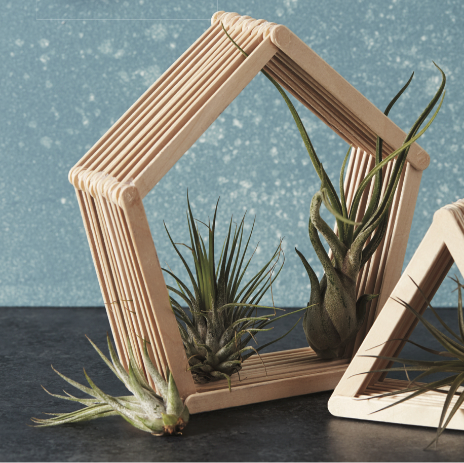Air plants are all the rage right now because they are so easy to grow. They thrive by absorbing moisture and nutrients right out of the air! To make this modern holder, all you need are wooden popsicle sticks and a glue gun. Make any shape you want; just glue one stick to the other and repeat the pattern. Tuck in an air plant between the sticks so they’re snug and secure. You can display on top of a table or hang with string in a window.