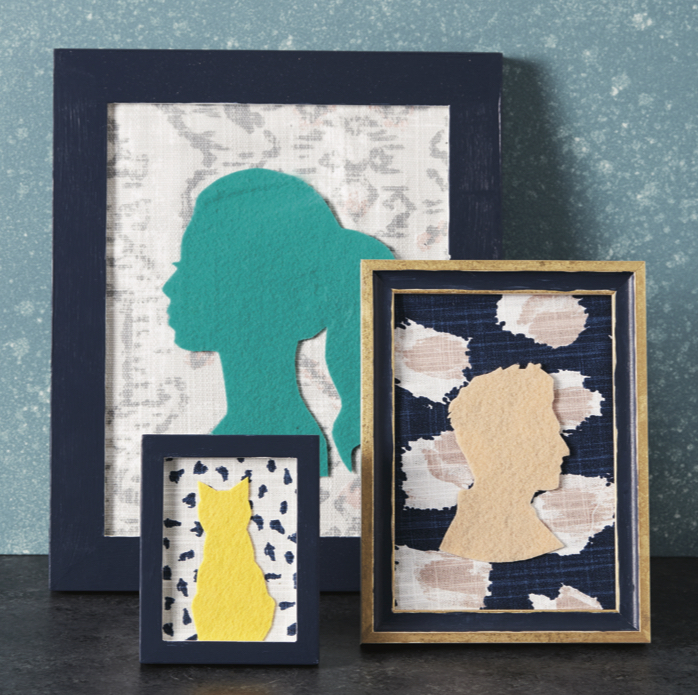 Mismatched picture frames can be found for next to nothing at thrift stores such as Goodwill and The Salvation Army. Create a cohesive grouping by painting them in the same color. Pop out the glass and cover it with a fabric remnant. Simply glue the remnant on top of the glass and cut the excess fabric. Pop it back into the frame, fabric side up. Trace a silhouette (we found images online) on felt fabric and glue right onto the fabric.