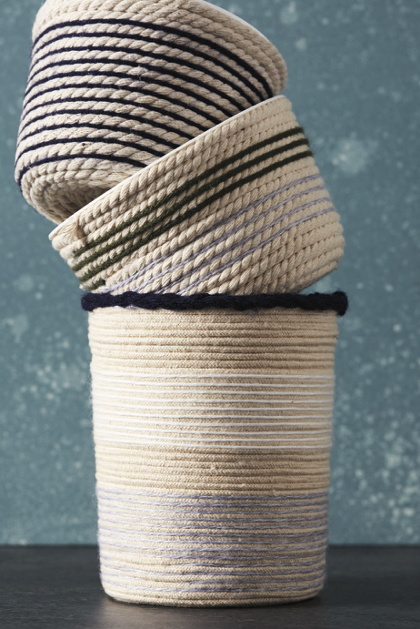 These nautical-inspired rope baskets are made from two humble, utilitarian items: rope and a plastic bucket. Don’t run to the store to buy a new plastic bucket. Instead, recycle an old paint bucket or even a warehouse club container for this project. It’s easy to make: Just dab hot glue on the center of the bucket’s bottom and attach the rope. Keep coiling and gluing around and around, working your way up the sides of the container until the whole thing is completely covered.