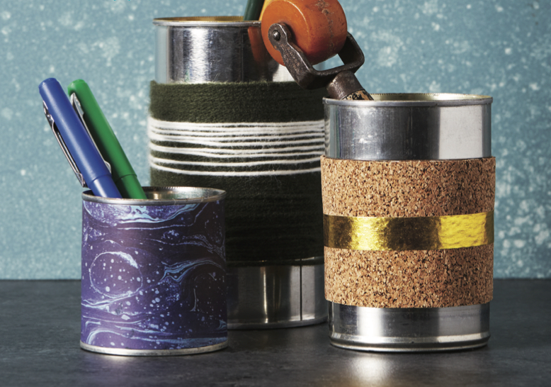 you need are empty tin cans (these once held beans, tomato paste, and soup). Give them a thorough cleaning and dry them completely. Cover the outside of the cans with a combination of decorative paper, washi tape, cork contact paper, and string. It’s an easy craft so make lots of organizers to keep things like crafting and office supplies tidy and accessible.