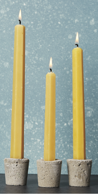 I’m not a fan of disposable plastic coffee K-Cups, but if you see a few in the office trash, fish them out for this craft. Simply rip off the top and empty the contents. Then fill the plastic cup with wet concrete (we used Quikrete brand). Wait 20 minutes for the concrete to set, then place a taper candle in the center. Let it dry overnight, remove the candle, and peel off the K-Cup to reveal your finished candle holder.